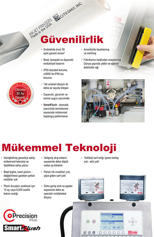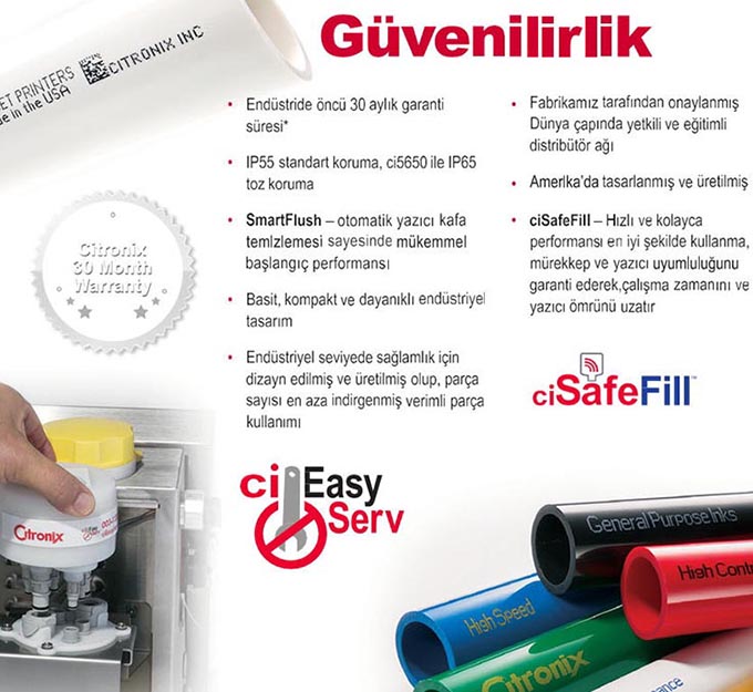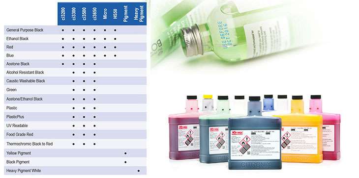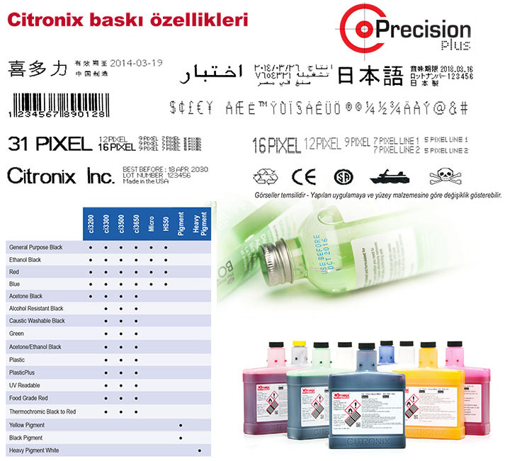 Ci Serisi Citronix ink-jet kodlama makineleri U.V. ışık altında okunabilen güvenlik mürekkebi ve cam yüzeyler üzerinde en yüksek tutunurluluğa sahip cam yüzey mürekkepleri ile çalışabilmektedir |